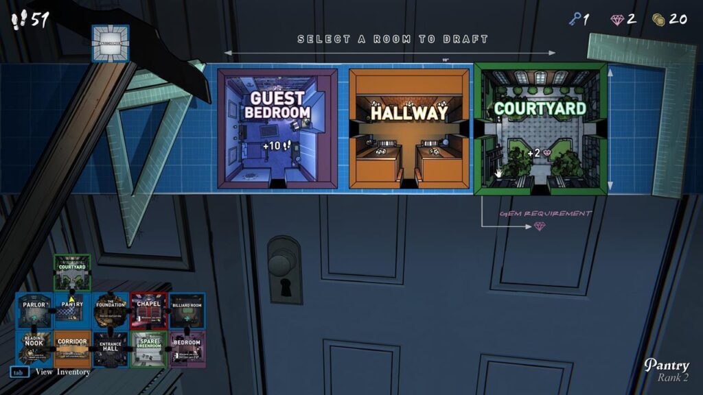 Blue Prince es un juego roguelike como ninguno otro ya que tienes distintas puerta y cuando las quieres abrir se te plantean 3 opciones que pueden ser la sala el objetivo es llegar arriba del todo, pero no todo es tan fácil a medida que subes las habitaciones te van pidiendo gemas y llaves necesarias para poder abrir las siguientes salas.